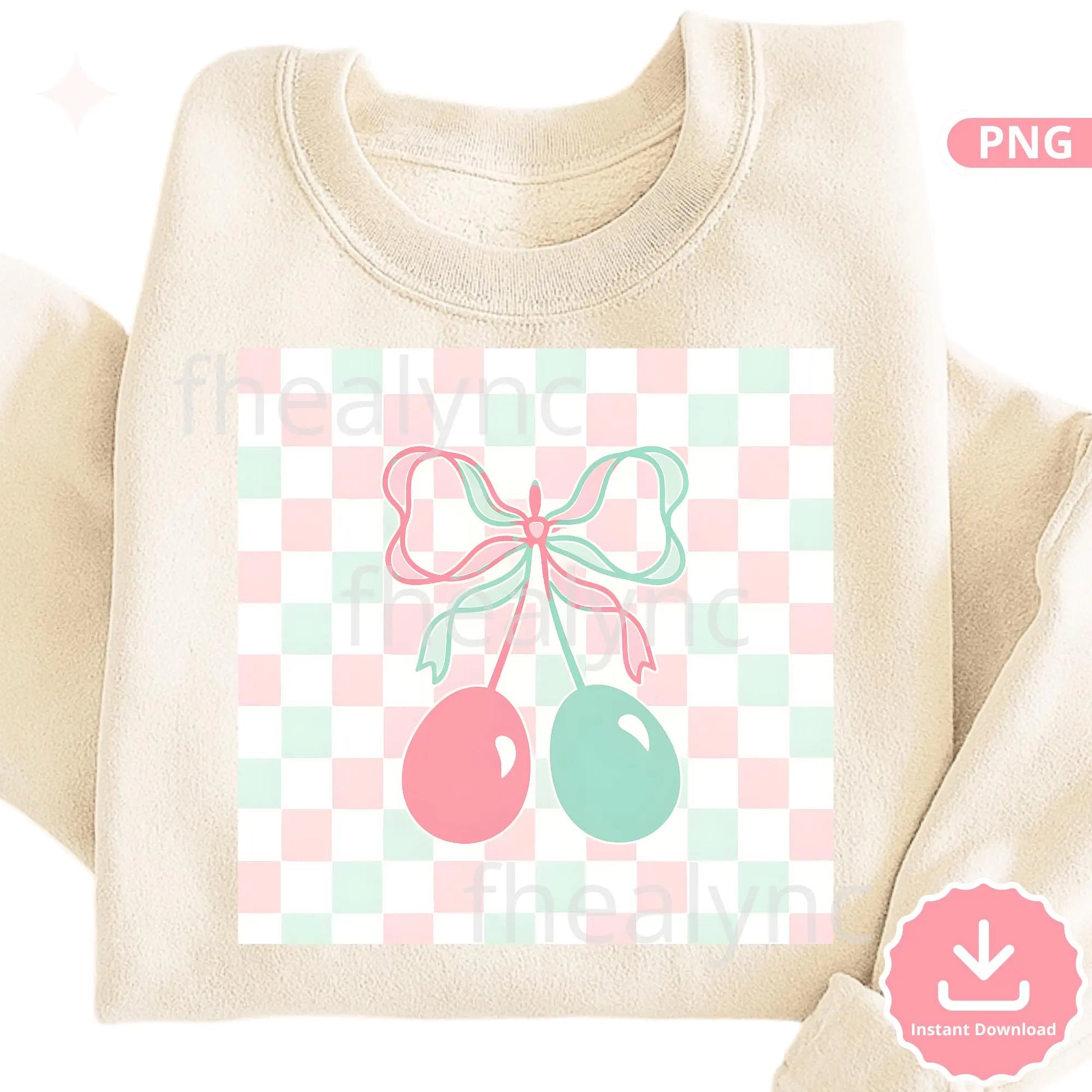 Looking for a cute pastel Easter PNG for your spring projects? This pink and mint gingham Easter eggs design features two glossy eggs tied with a sweet bow, perfect for shirts, sweatshirts, mugs, and boutique spring apparel. This high-quality Easter PNG download is ideal for sublimation, DTF printing, and small business crafting. The soft pastel color palette makes it perfect for trendy spring outfits, kids Easter shirts, and handmade gifts.