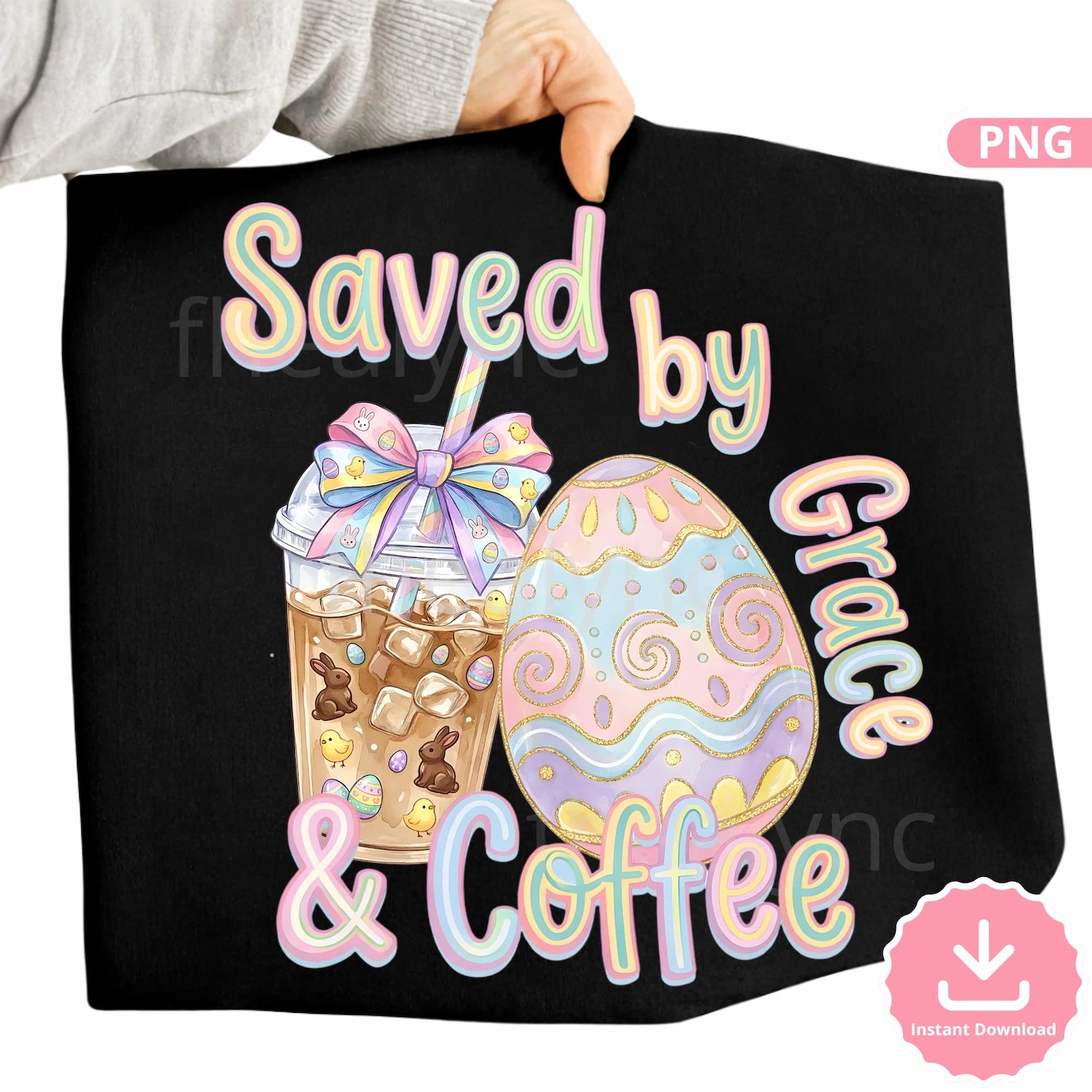 Celebrate Easter with this adorable pastel retro “Saved By Grace & Coffee” PNG featuring a cute iced coffee with bow, bunnies, chicks, and a decorated Easter egg. Perfect for Christian coffee lovers and spring apparel! This trendy pastel Easter design is ideal for sublimation projects, t-shirts, sweatshirts, mugs, tote bags, and more.
